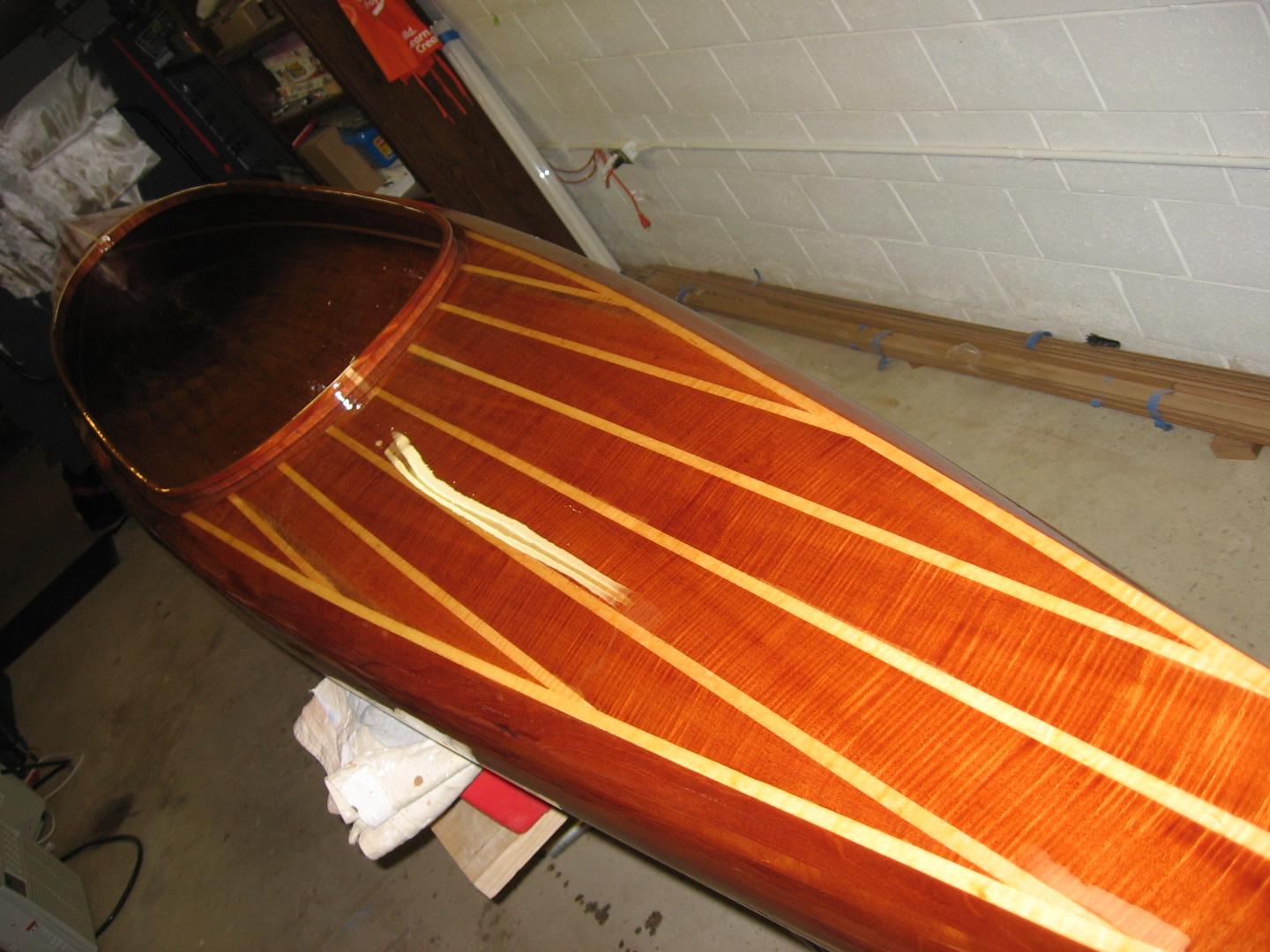 Here's the reason I have not posted plug pic's recently. I've put more than a few hours in this project. It is a strip built 2 person kayak designed by Nick Schade. It took me 7 weeks to get my hands on 3, 19 and 20 foot long pieces of Genuine Mahogany from South America. This kayak is built from one of those pieces that started out rough at 3"x8"x20 feet. All strips were indexed and numbered as they were cut, so the kayak could be built with consecutive pieces. You can see the result in a repeating pattern on the finished boat. The accent pieces are also from only one board from Pennsylvania of nicely figured Tiger Maple. For the most part, only 3 tools were used to strip the hull and they are, a razor knife, block plane and a sanding block. I've got the better part of 350 hours in this project.