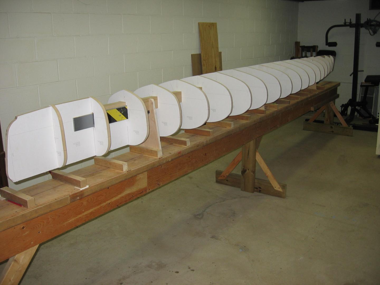 Thanks guy's ,yes it is a beautiful design. Yes, it is the Microbootlegger, it weighs in at around 40 pounds, and it has made it out of the basement to apply the spar varnish for UV protection. I used a strongback that I made previously for a 17' Rangeley for a stand. The actual strongback for this project is a 2x4" square tube frame. I purchased the plans only and made the forms as well. Here are some pic's of the early stages.