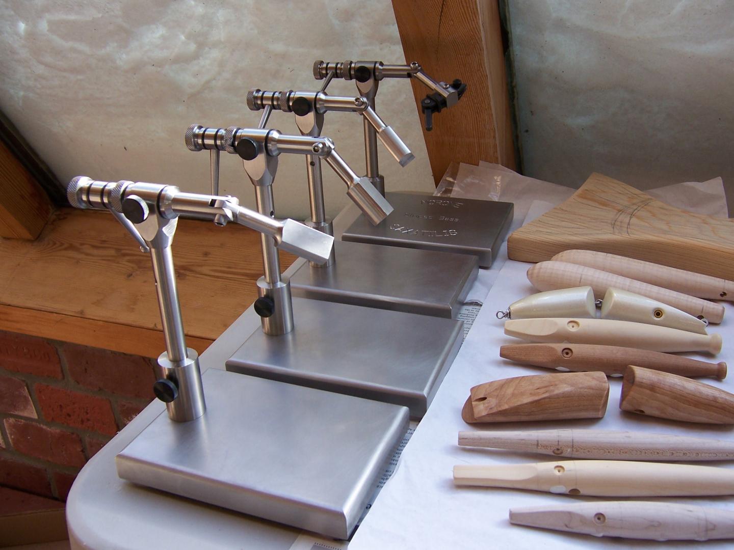 been busy working on several things this fall-winter. Not just plugs. Here is where I am at this point. Got 4 vises pretty much done. Still have to machine the jaw holder but need to figure out which size I am going to put in so that part is un done. This has taken most of my spare time since last year but I want a new rod or 2. Then I got a cypress striper with ayc fins to maybe hang on the wall down the cape or a weather vane. Still got to figure out the finish and such. Probably end up looking like this next fall too. Only so many hours in a day. Then plug wise I got 1 jointed darter done for a promise. a couple tiger maple Bass Aquas for a promise. For me I have some needles of various sizes. Some I already make and a few new ones. Some top water stuff , canal and a Gibbs copy. Darters. A Pichney jointed so I can give VB back his original. A large and small Pichney Danny and a med. BM Danny copy. AS you can see I got lots to do before I get them done and this weekend has been all snow removal