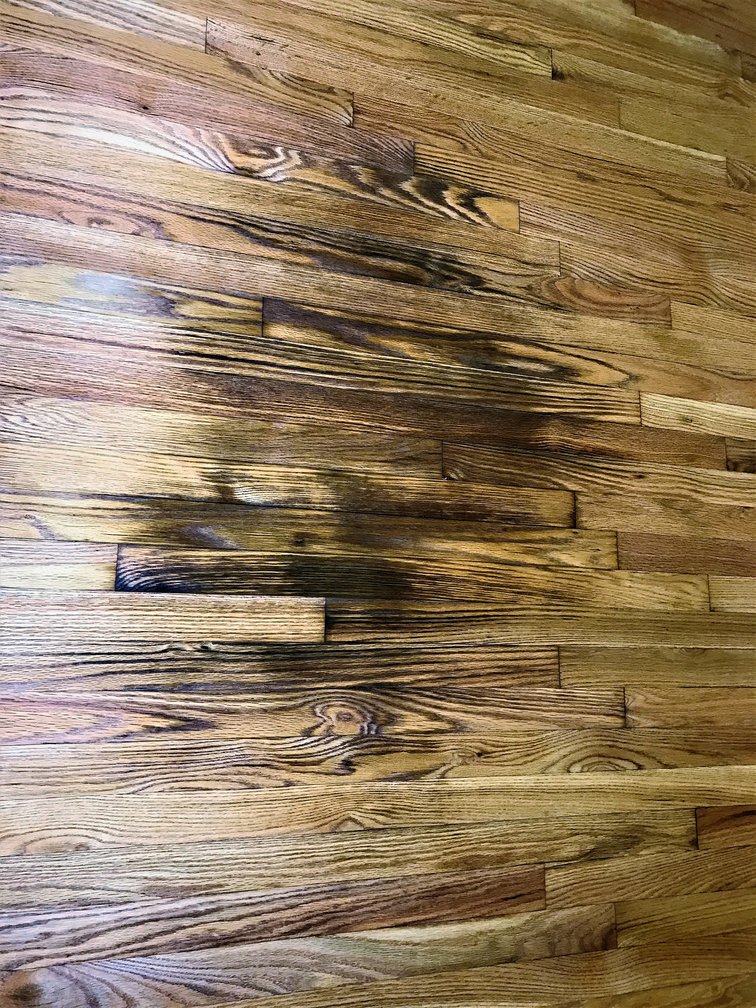 dealing with a resto right now this is a water stain...had a pro sand and he put down 1st coat of poly- I stopped him at this point. I think I have to re sand, dark stain, then poly.