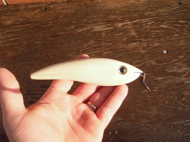 The turned model shows if you look hard, the dowel plug in the tail. The blank shows the dimentions. 3"from hook hole center to nose, showing the 3" area for the weight and the length from tail to end of weight hole 5". Plug 8.25" total length.