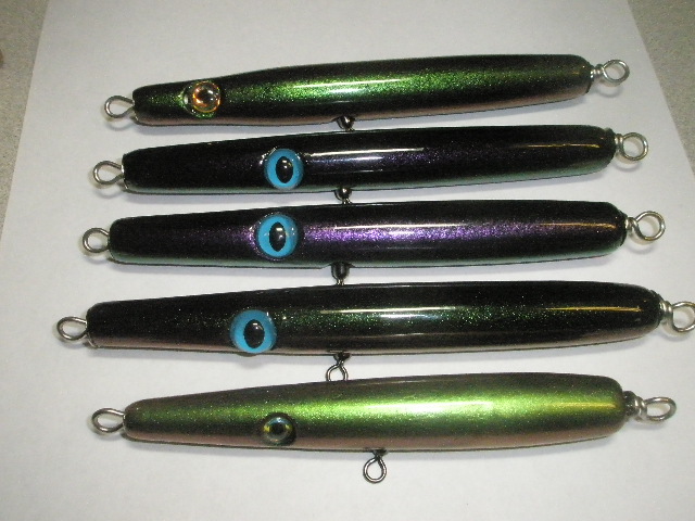 There are two ways to weight them. Ballerina/howdy style will float vertical with the nose about 1-1.5" out of the water. Zara/Jigman style is to weight them about 2/3 back with a fatter tail so they float at about 45 degrees with the line tie near the waterline (dropping the line tie below the center of the nose helps with this style). The howdy style casts further, the jigman style works slower. Both work well. |