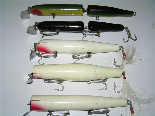 troller's-lrg. sloped head small swimmer's conrad's-lrg./small sloped head conrad's-lrg./small eely'-straight/jointed..2-3 size's atom's-3 size's///1 jointed giant pike-jointed atom reverse darter's sandeel's[aka]needlefish//// a true needlefish is huge compared to a sandeel, but some how they all get branded with the name of needlefish. maybe missin a few?..style's. I was told toward the end he had some spun up by lupo cause of overload...so maybe it was the lrg. sloped troller's with the sticker's for eye's that have gotten mixed in with danny's . |