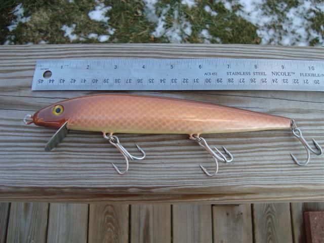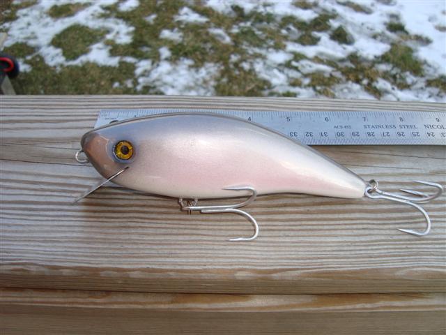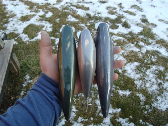Finished these guys up. They turned out to be a real project. I don't know how the musky guys do those real big baits all the time. They took several coats of clear to get where they are and could probably use another to get them real glassy. Alot more materials than I would have suspected all the way around. Epoxy, plumbers epoxy, wire etc. The two hook ones are 9" long and 1 3/4 around at the widest part. The smaller one is from the same template just modified a bit. The Rebel looking one is a body that Copycat gave me and I finished up. I need some tails for these and I will be seeing a couple guys tomorrow who could probably help me out there. I swam the two big ones with two different lips and saw almost no difference. I was going to try them with a third hook on the tail but liked them the way they were with two and didn't even try it. These were fun but I can't wait to get back to my small stuff.