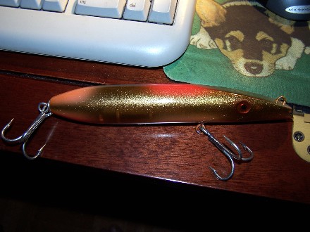 I had to promise I would fish it and send him a picture of the first fish I get with it. I am going to see him again tomorrow night at darts and the shower is wearing off so I think the best thing to do is take this plug for a swim and calm the nerves and hopefully I can do him one better and send him home with fish to share with the builder.