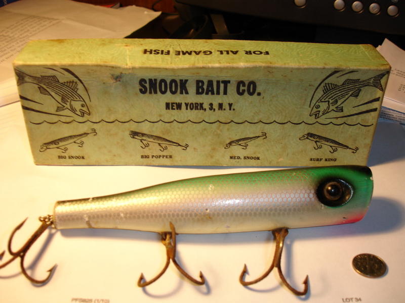 It is a liitle beat up from the hook points, but not too bad. The box is in fair shape. I am told that the box is worth more than the plug! If anyone has any info about this Snook Bait Co Big Popper in blue herring, let me know!!!! Attachment 41059 Attachment 41060 |