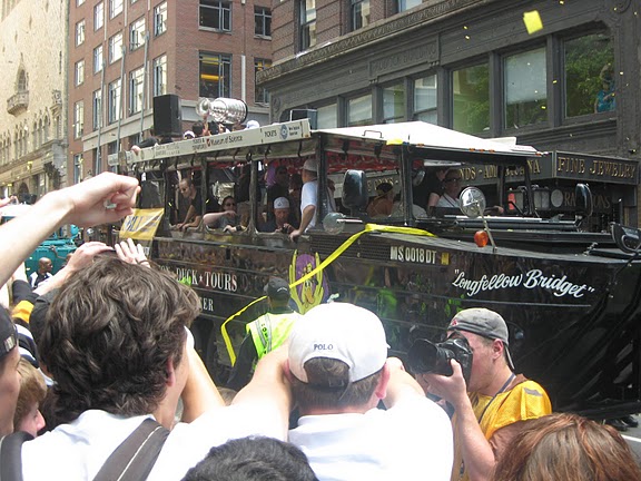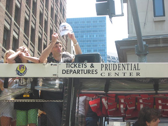 Around quarter to noon, 45 minutes after the start at the new Garden, the duck boats arrived. Of course, the whole Jacobs family was riding in the first one. :doh: