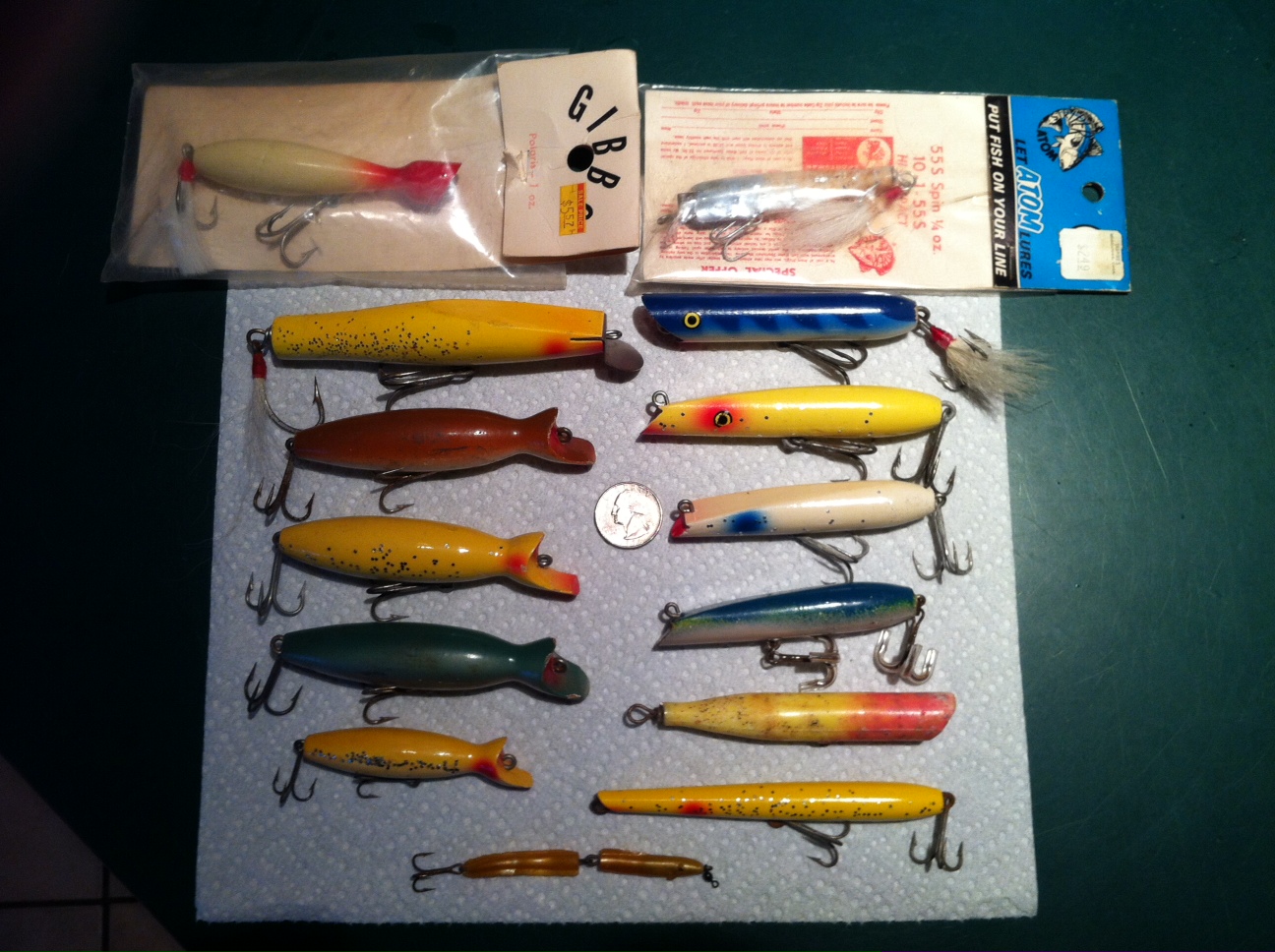 Here's a few of my mini plugs: In this photo, the pencil popper, atoms, brown bottle plug, green bottle plug, blue /green darter and atom popper, gibbs popper, are all available for trade. I have more of the pencil poppers (NIB) for a similar condition mini as well. Jointed eel is available also