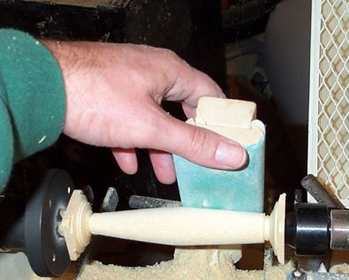 Next, we’ll turn the tail down to .6 inches. Again, you’ll taper this to the center point. At this point, the blank should be close to the final specs (.8 at front, 1.1 center, and .6 inches at the tail). When tapering the front and tail, you can take just the very ends down to the specified dimension, then turn the rest. Alternatively, you can slowly take the whole section down at one time. To make sure everything is even, I’ll use a sanding block to do the rough sanding. Using the block insures that the tapers are even.