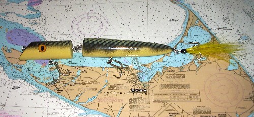 my daughter showed me a pic on the cover of some magazine she had at work. I remember it was a big jointed plug. w/ a largemouth bass hanging on it. so here,s what I came up with for STRIPERS. I don't know if I even want to try to throw this, it kind of BIG. maby just let it go out w/ the tide an give it a shot. HE'S 11" long weighted in the tail section. 1.1/4 round. put some 1/2 CAT EYES in to give it a mean look, an scaled the back.he's not epoxied yet maby pait a little more BLACK on the sides of the head.to look more like the body section.