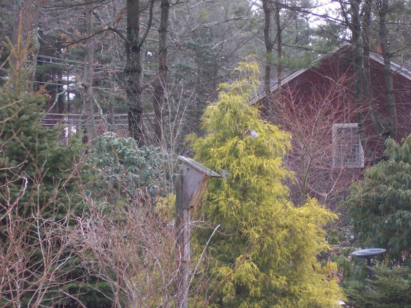 Male bluebird on back of house and female on front checking out the accommodations this morning. Time to cleanout your boxes as they are searching right now.