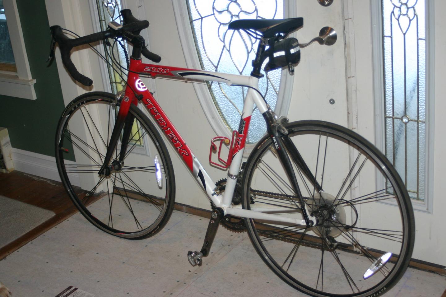Its a TREK 2100 56 cm. These pics are of the actual bike taken this mmorning. I can work in the shimano shoes as well, they are a size 11.5 and have never been worn, tried on but never worn. The computer is also new with 0 miles on it.