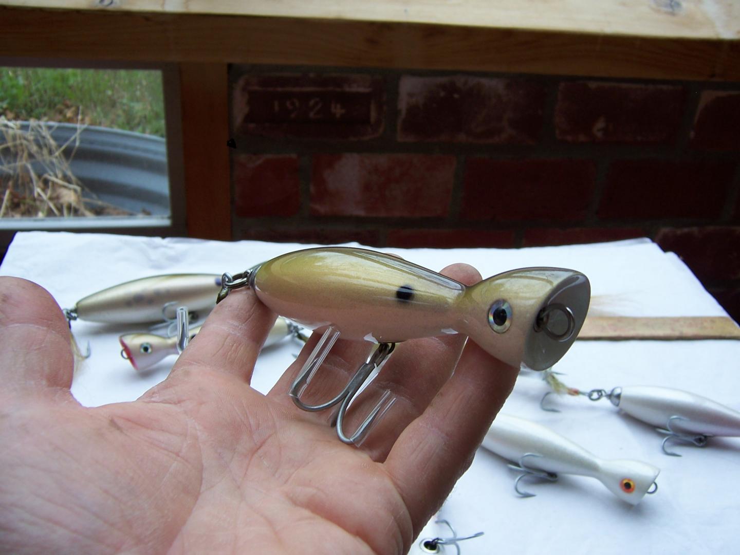 These are my heavy canal poppers. Very small, maybe 5 inch and 2 1/4 oz. A normal size one I make is in upper left corner for size comparison. They cast as good as any I have thrown and pop good too. A very good producer for me last several years. The siwash no exposed tail wgt. ones are much lighter and for boat. They will pop and swim nicely.