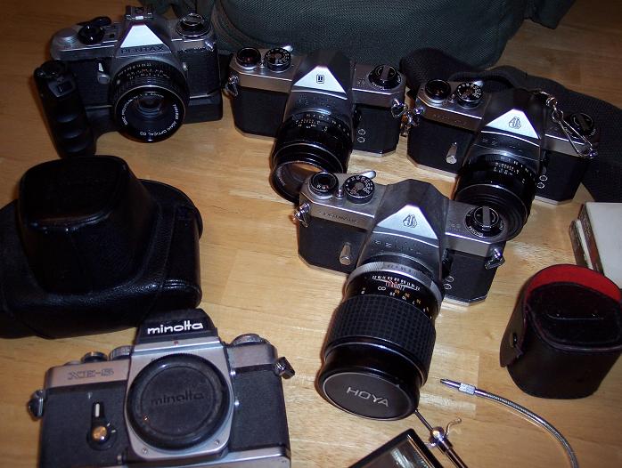 This is a camera I had used for many years and will miss terribly.....but the digital age has been here for awhile and I have not used them for quite some time! Included are 2 Pentax (Asahi) Spotmatic cameras w/50 mm lens on both. Pentax "Honeywell" model of same Spotmatic camera. (Spotmatics are screw mount) A Pentax ME Super (K mount) with autowind (not sure if autowind works anymore.) Also a Minolta XE 5 body (K mount). Cameras are in great shape....one spotmatic has 2 chips in the viewfinder glass but works just fine! Also included is a Hoya 135mm lens (screw mount), 2X extender, flash, and some other assorted extras. The bag cost me $80.00 25 years ago and is heavy duty canvas...dusty and faded but still in great shape and is padded. This is a great buy for a beginner in photography, a student in photography or anyone who just likes the old cameras. $100.00 for the lot.....you pick up! Will ship for an additional $20.00 but no guarantees on anything as they are old and I have not used them in about 4 years......they do work though, just not sure on the autowind. Feel free to ask questions for details on the lenses.