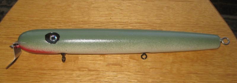 Then I made a Giant swimmer from a laminate I made of red cedar sandwiched between 2 sections of AYC. I burned bands at 1 inch increments ala Mike Fixter and gave it a nose weight under the lip.