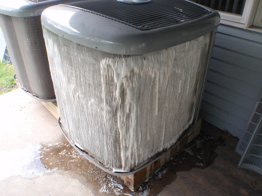 Now put the cleaning solution into a spray bottle/weed killer type sprayer and spray the solution on the out side of coil as evenly as possible(do just one side at a time).and wait a few minutes untill you see the solution turn to foam,it'll push out dust,pollen,dead bugs and leaves,it should come out looking blackish & brown.Once the foam starts to recede take the hose place it on the inside of the coil,meaning the interior where the compressor is and wash inside out,wash the coil down from the top to bottom as your doing this look on the opposite side of the coil and you'll really see the crap & filth come out of the coil.