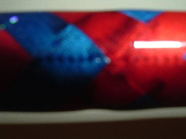 hey billy Id like to know what kind of super tape you are using that you dont have issues with the thread sliding especially coming off the front grip.I am using the 3m stuff and I have always had small problem with some threads especially the metallics sliding as the wrap comes down onto the blank.these would be the threads going up to the right and down to the left(I think )they also tend to stretch a little when the water based cp is applied.I was shown to cp from the center out just past where the end wrap will be.if nessesary you can then pull the little bit of slack out of individual threads. After this dries I start end wrap and taper threads from wrap to be covered.This way nothing shifts. IF you have and easier way I*d appreciate hearing what it is.I have noticed that the threads all seem to slightly stretch when wet and the pattern will get a little loose but it shrinks back into place when it dries.This is why I recomended the gentle dabbing with paper towel so you dont shift anything out of place.I have only seen the haze you refered to when cp is applied and the excess is not taken off.I have been using the flex coat for a long time and have had pretty good luck with it but as soon as I use up the couple of Quarts of high build I have I think I will try the Aftcoat stuff.I dont think fish was talking about spaces but the show thru of the blue where it crosses under the red but maybe I misunderstood.Packing the threads is also a lot easier if the threads are done in multiple thread passes instead of individual ones.This gives a litle bit of a saw toothed pattern at the cross points but it looks good.I thought I saw this in the pattern he did but again i could be wrong.And again I will listen to what anyone has to say about how they do thier wrapping and I am willing to adapt to any method that is easier or works better.What Cp was it that you got the crystal look with? I tried the guderbrod stuff once that ha to be cut with alcohol and thought it was crap. I think it was 811 but not sure.
