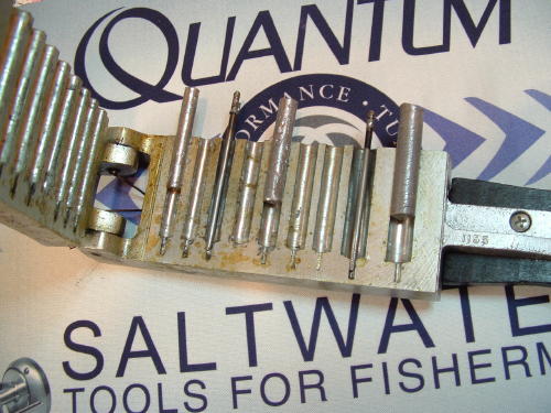 I bought a blank do-it mold and drilled holes in it with a drill press - 1/4" , 5/16" and 3/8" and then drilled a smaller hole enough to hold a coathanger wire so when I pour the lead, the wire is centered and gives me a nice tailweight that the stainless wire goes right thru.