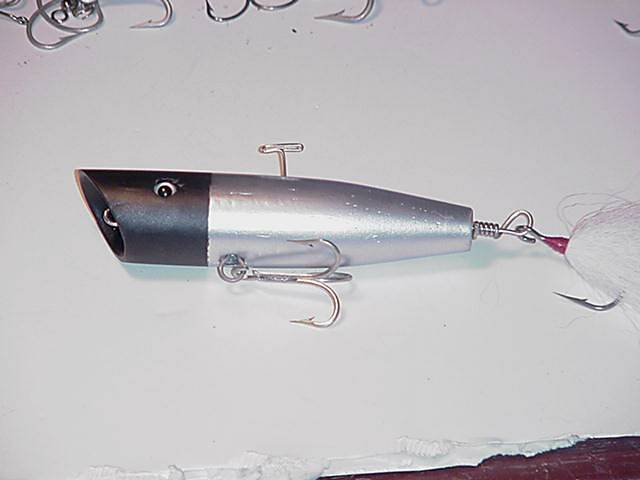 The popper is done (except for clear coat) Aluminum w/black head. I used a Cap'n Bill original hook hanger for the belly treble and a Cap'n Bill body weight as well. I kinda like the "Old School" look. I can't wait to toss this one onto the rocks at Pasque next May.