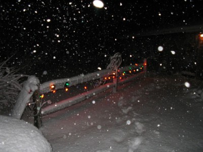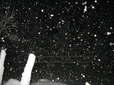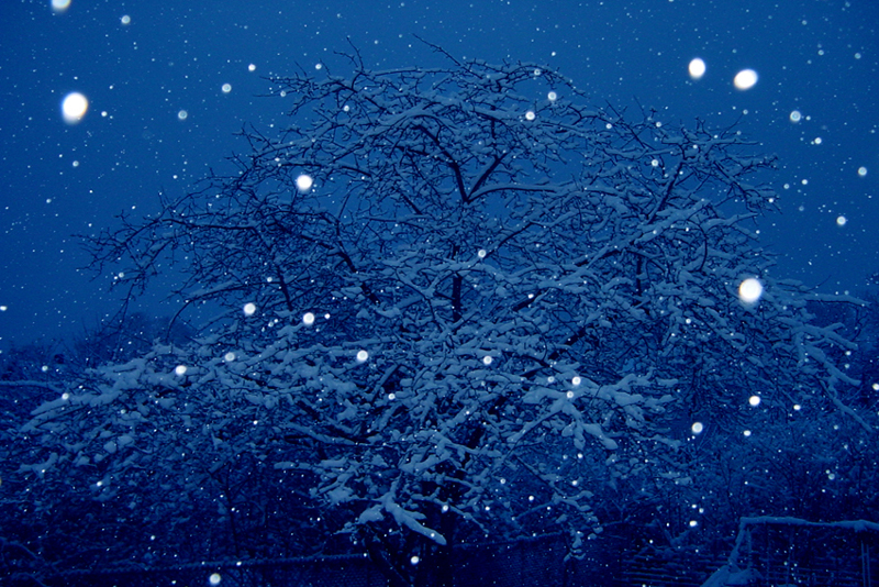 A PIC of a Crab Tree in my Back Yard,the flash reflected off of the saturated snow flakes & lit them up.