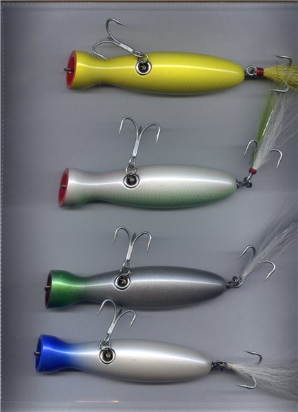 Those are the best looking poppers I have ever seen! Your killin me over here  The color and pattern choices are PRIMO! Excellant job on the tails as well. I need all the specifics though. Whats the weight? What are they made out of? How did you get the faces cupped so perfect? What clear finish are you using?