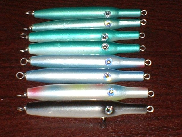 Heres a few stubby needles I finished recently. They are 5 1/4 inches long, Maple, with weight behind the belly hook. They weigh about 1.5oz.