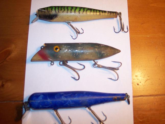 Can you give me a hand with these. Looks like the bottom one is an Atom 40 dark blue swirl. No idea about the top two. Both appear to be wood. The mack has a built in swivel where you connect your line. The middle has funky double loop eyelets where the hooks connect. Would these be original hooks? Also, Darter lip is concave.