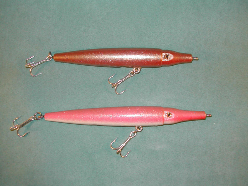 THese guys started out as needles, But when I painted them they kept saying squid to me. About 7" long, hard maple. The bottom one has three slugs over lead in the belly. Top one only on centered in the belly. Been trying to decide whether to put the trailer hook on the top one at the other end a tie some tenticles.