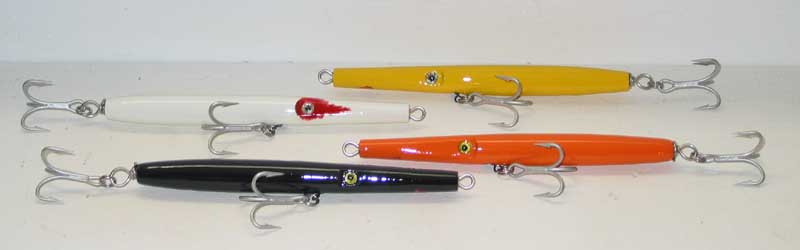 The stubby prototype is 5-3/4" long and just under 3 ounces. It's AYC and packed with lead. Casts like a mother but floats/really slow sink at a 45deg angle just under the water. Leaves a wake like a powerboat...I can't wait to see how this thing fishes
