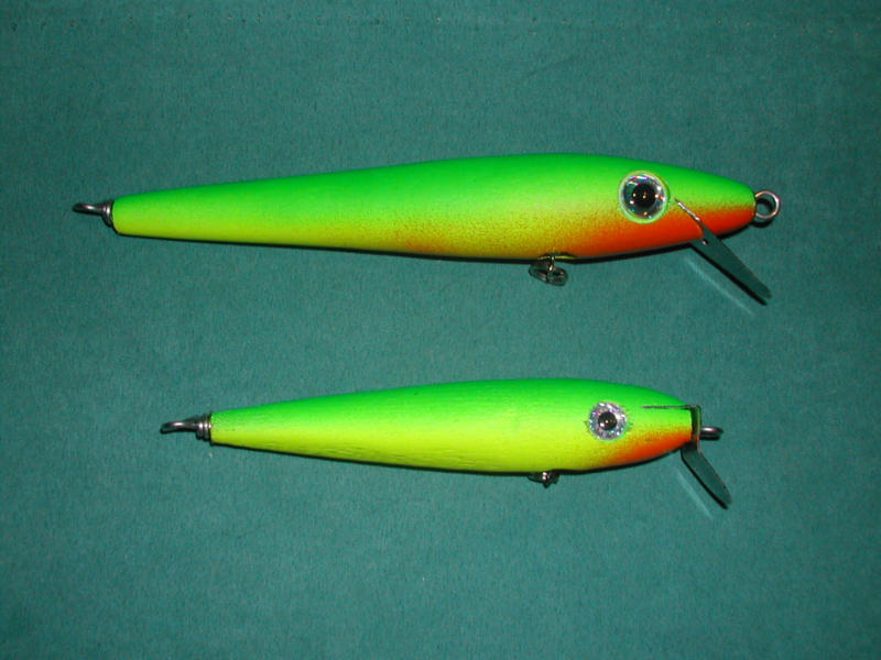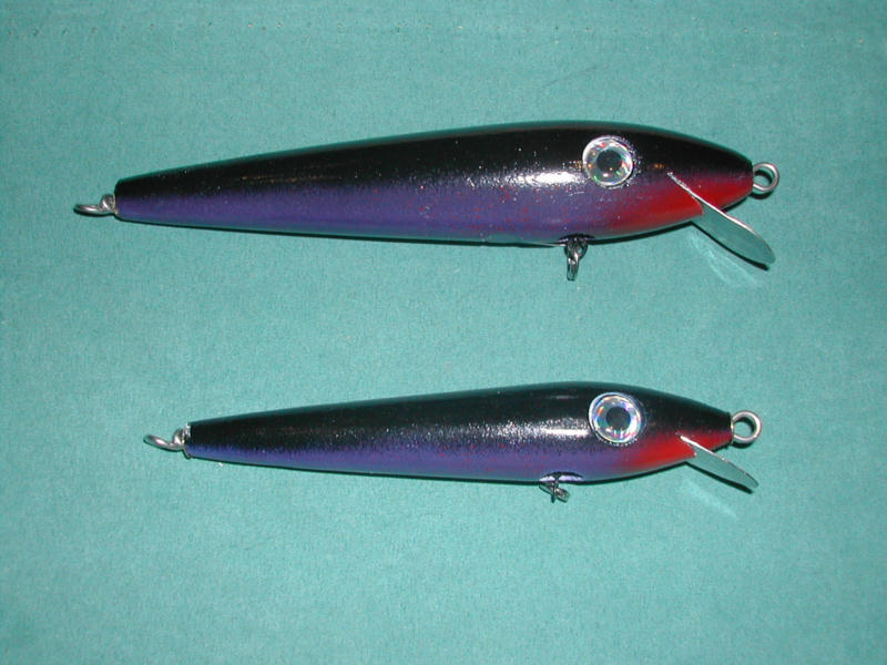 Thought I'd take a stab at some home brew bomber type swimmers. My apologoes to NJT for the re-engineered lips... :-) Big ones are almost 7 " long. The smaller ones are are just over 5" long. The big ones have a belly weight right at the thickest part of the wood.