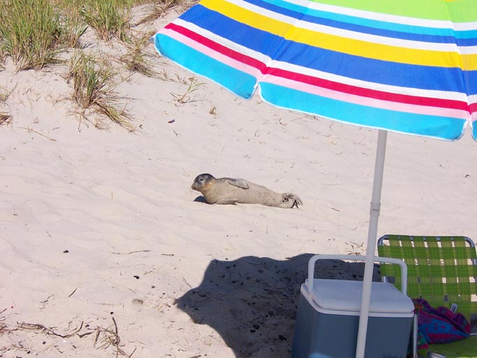 Here we were just sitting on the beach and who show's up to crowd us. He 's got the whole beach and he will not let us move more than a few feet away all day. He just slept all day in the sun and left us alone but he wanted to be close to us. Once in a while he would go out for a swim but he would be back in to sleep near by. Daughter thought is was cool but I think he was sick. We stayed away as far as we could. Paul