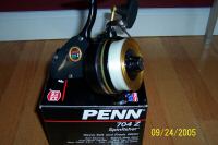 Penn 704Z in perfect shape, I bought it and used it a couple times. It has the manual pick up, I also still have the bail. Comes with box and papers. I packed it with grease already. Has new 20# Big Game mono.