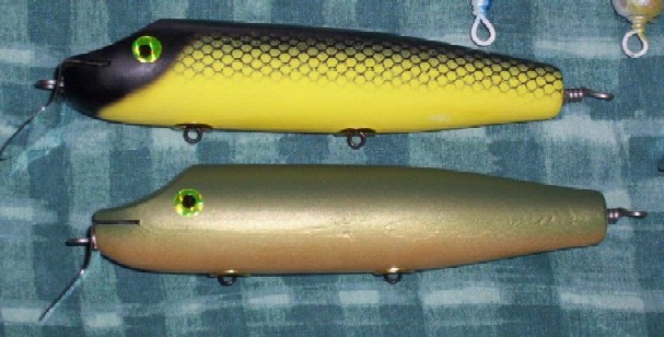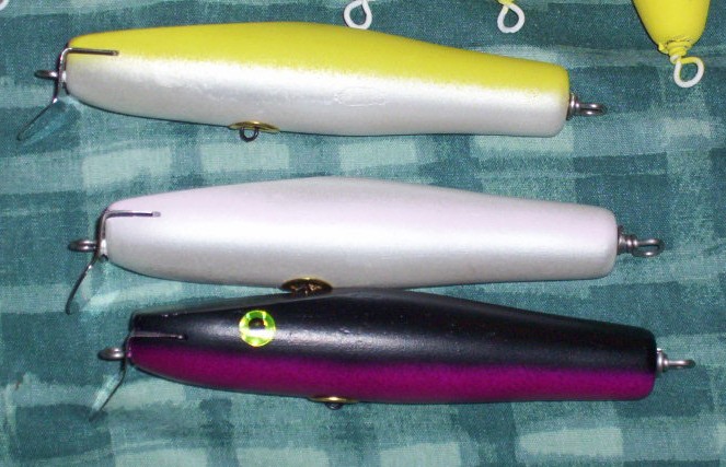 The poppers are 4 1/2" and sit almost vertical with the nose barely sticking out of the water(in the sink anyways), the sorta surfsters are 5 1/2" and weighted in the nose, the pikies are 6 1/2" and also have a shot in the nose. The two dannys are 5", with one being skinnier(only about an inch in the middle) than the other. The poppers are poplar(kinda rhymes!) and everything else is red cedar.