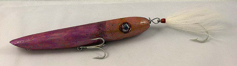 This is a slow sinking squid pencil popper. The body is 6 1/2" long and weighs 50 grams...4 grams shy of 2oz. I tested it out yesterday afternoon and it goes real nice. I plan on making a few more of these (not necessarily all squids) over the winter.