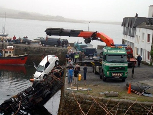 The first one is real,because he didnt use any outriggers at all and he miscalculated the weight of the minivan WITH water inside. the 2nd and third are photoshopped ,look closely and you can see the size and distance doesnt match.