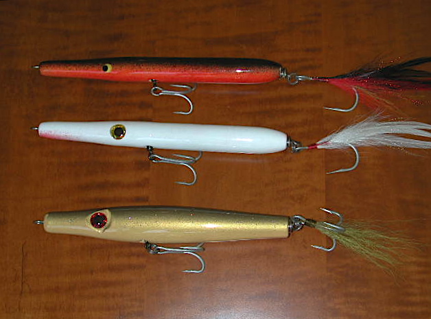 Top two are Salty's reject bodies. Dark is 2.75 oz, white 3 oz. The bottom is a loose knockoff of the beachmaster BI needle, 3.5oz. The originals have been fishing well for me this year.