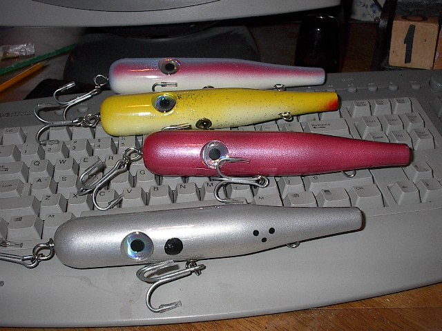 You came to sites on top of the heap George ,, fantastic work ,, 20+ yrs. building shines...I just did a 10 swap over there.. just turning bodys (predators)... I'm changing sealer,, experimenting,,, I'm getting set up with new stuff,, couple of things $$$$.. I have 8 handcarves knockoffs..Big O ,,bomber,,cordell,,Gary2,,top gun,plastic type stuff.. I gotta get to work on needles soon for the bag .. want to fish knockoff Pichney pocket rockets next year . Had darter revelation to stop splitting want to work on that.. Lots to do so little time .. I wish winter was longer ,.  .. You taught me handcarve last year George .. thanks for that... is 4 hrs a long time to make a body ?.. Crash .. Blue/whites look mint .. can you slow sink them ,, vary depth slightly adjusting speed of retrieve ? even bring them on top at slow retrieve ..