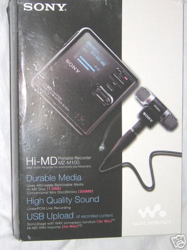 This Hi-MD portable audio recorder is ideal for journalists and musicians who need to make high-quality stereo audio recordings using cost-effective removable storage media. The MZ-M100 uses affordable Hi-MD media with 1GB storage capacity. Three recording modes are supported including: Linear (PCM) 44.1kHz/16-bit, ATRAC3plus 256kbps (Hi-SP) mode and ATRAC3plus 64bps (Hi-LP) mode. The recorder supports USB uploading + downloading with PC (using supplied Sonic Stage software), and USB uploading with MAC (using supplied Hi-MD WAV importer software), allowing transferring audio recordings to a computer in .Wav file format. This Hi-MD device can also be used as a USB mass storage device, allowing storing data files on the Hi-MD™ disc along with audio recordings.