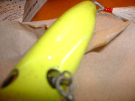 maple popper 2.7 oz...val oil/min st. mix....4-6hr soak...bins can primer....fl chartuse work type(safty)paint and devcon 2 30 min....epoxy split hard to photo but it split from the hook hole towards the back...also from the hook hole to the eye to the nose and a split from the tail along the top