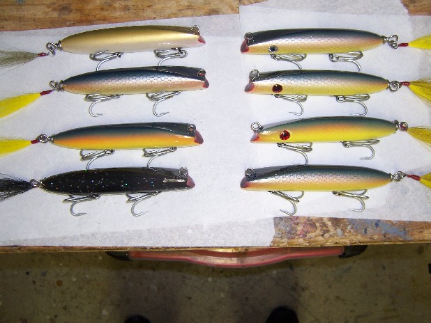 A set of 40 Jr. style plugs, they are 5 3/4"(less bill and tail hook) and weigh 2 1/2 ounces , powered by a #2 pikie lip, the plug is eaisily tuned to run on top, or a few feet below the surface, front belly hook is a 3/0 VMC, mid hook is a 2/0 VMC6X hook, both hooks are cut and crimped then siver soldered, I have this belief that, that style plug benifits by close riding hooks , swivels are Kroc SS swivels, tail hook is a 5/0 VMC Siwash...