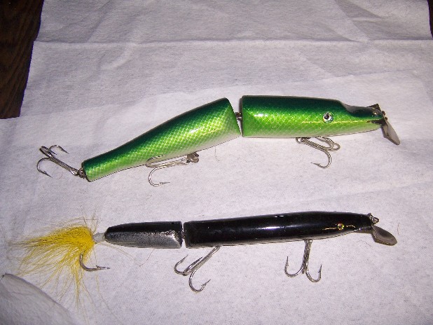 Next are a pair of early jointeds, I made several of the solid hook in the tail eels before changing to a more conventional style... it worked, but not well, the tail section lacked action, the bills were mome made, the next is of one of my first jointed pikie's, this thing is a beast, 12" long made of rock maple, it weighs just shy of 7 ounces, although it appears to be through wired, all connections were pinned,the pins were recessed and then the holes covered with putty, I made 3 different bills to get the damn thing to swim... it caught several fish before i retired it for a more user friendly model...