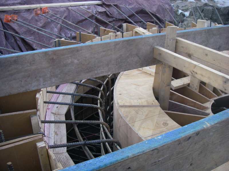 This probably doesn't interest anyone. But anyone who has ever done concrete form work may find it intriguing. We (2 of us) spent 2 weeks inside pre-building it (was nice being inside during the snow). The outer circle (face of plywood)is 13'-8" in diameter. The brick shelf has a waterstop and the inside piece is a cone. This was the tough part as it has to be totally suspended with no support from the bottom. The inside cone presents a problem as the concrete will want to float the formwork.