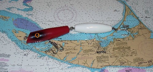 Every now an then I frequent used book stores an last week I hit (paydirt) FISHING LURE COLLECTABLES VOLUME ONE. $10.00 so it went home with me. super book an Ifound a great little lure in it. the MUSKY WIG-WAG 6" long Red/White, built in 1934 so heres my (take) on the old plug. total lenth 9" Jointed w/ Cat Eye, hand carved, rattler can painted, Im just starting to get more control on SPOT shoting so I got the Black Patch around the Eye to accent it some. thats it