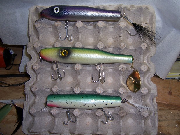 I've been busy for sure, lot's of stuff still "curing" I'll be painting all this week.. I've got three sizes of needles, three sizes of pikies and surfsters, 40's and eel skin Jr. as well as some "tricked up" Copies of Capt'n Bills swimmers all to be finished...