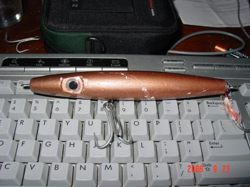 Chartreuse Hab's Jr. 2oz. with 4X 4/0 VMC. Time to upgrade to 6X on the front hooks.