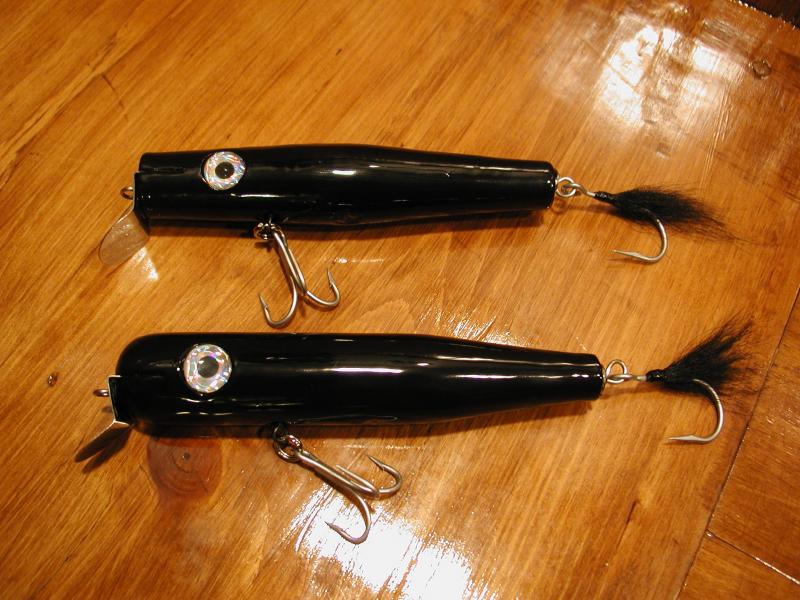 Here's my first even batch of plugs ... black beauties they are, me thinks. One pocket rocket-style needle, two Atom Jrs., and one Danny. Each weighs between 1.75 and 2.5 ounces. Tails were tied by me, too. Nice thick, juicy coats of epoxy, for a bombproof shell. VMC hooks. Ready to rock and roll.