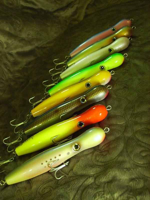 Here are the 3oz Darters. These run about 5 feet deep and their darting motion is not wild, it's more of a searching baitfish looking swim. The action is dead-on to the original Pichney Darter.