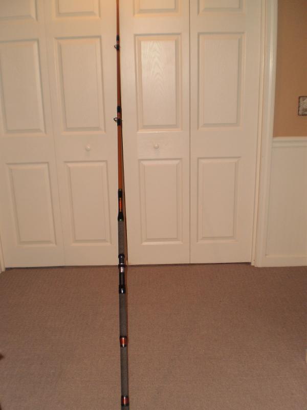 Not sure what model blank this was built on... It is wrapped conventional with a trigger finger and Pac-Bay guides. Kept it in very nice condition. Used it mainly as a smaller chunking rod, but for the open beaches I normally fish, I just needed something a little longer. Makes for an awesome jetty rod... or if you just like smaller heavers from plugs and such. Can email better pics if interested. My brother measured the length from the butt to the reel seat and said it was between 25"-26". I'm not sure if he measured right to the middle or what....