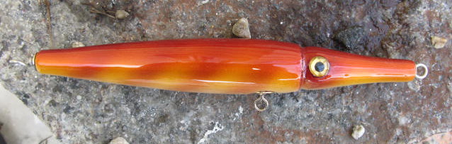 I call this a squeedle because it's a squid based on the needlefish profile I do. It's made of oak, about 7" long, and weighs about 3 ounces. I set my needles up to sink in a horizontal position or with the nose ever so slightly up. I shoot for about a foot per second.