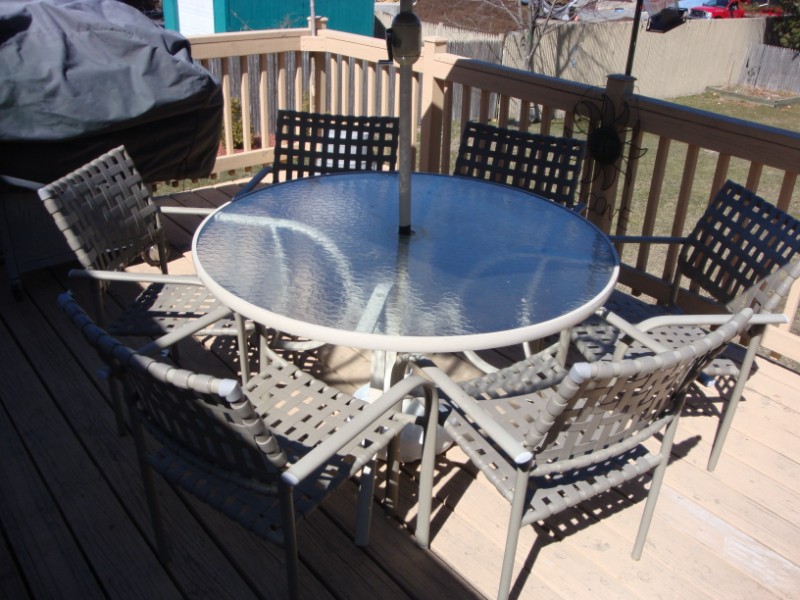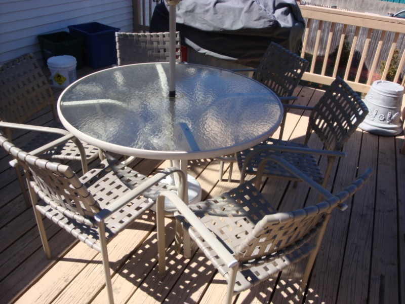 Includes glass table, 6 chairs and umbrella and base. Nice shape. PU in RI. ASAP $ 40